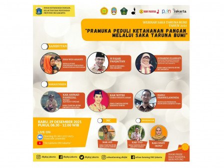 Jakarta – Dinas Ketahanan Pangan, Kelautan dan Pertanian (KPKP) berkolaborasi dengan Kwartir Daerah (Kwarda) Pramuka Provinsi DKI Jakarta akan menyelenggarakan Webinar Saka Taruna Bumi Tahun 2021 yang mengangkat tema “Pramuka Peduli Ketahanan Pangan Melalui Saka Taruna Bumi”, Rabu (29/12) besok, mulai pukul 08.30-12.00 WIB.